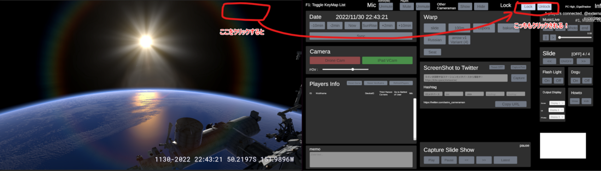 ISSメタバースはパブリックビューと管理画面を1つのアプリで完結させている。なので2画面のマルチディスプレイだ。